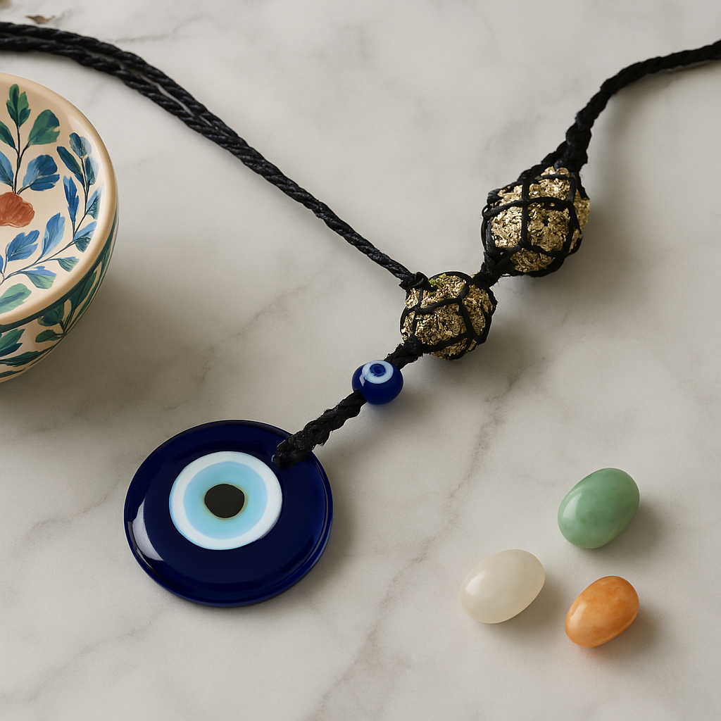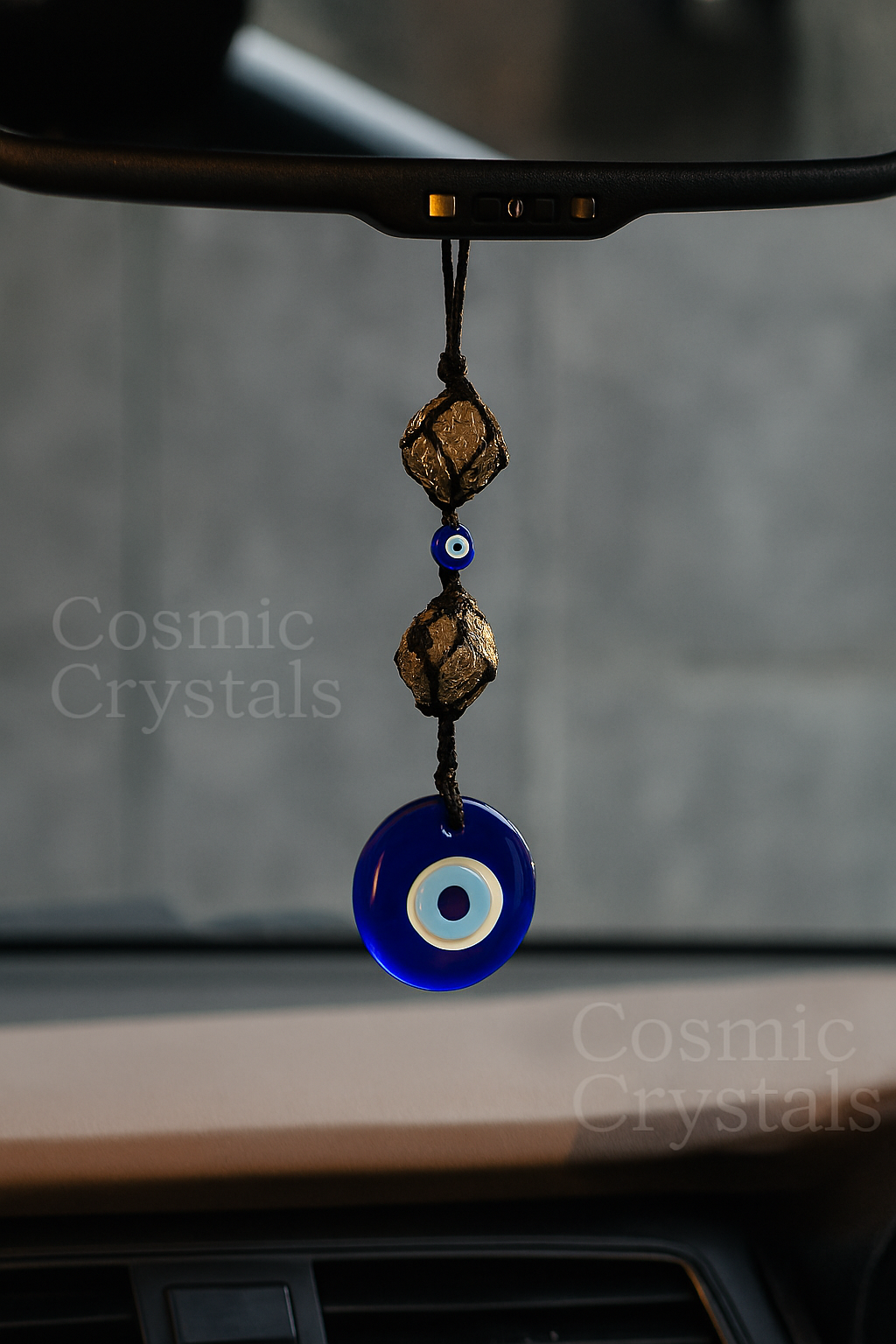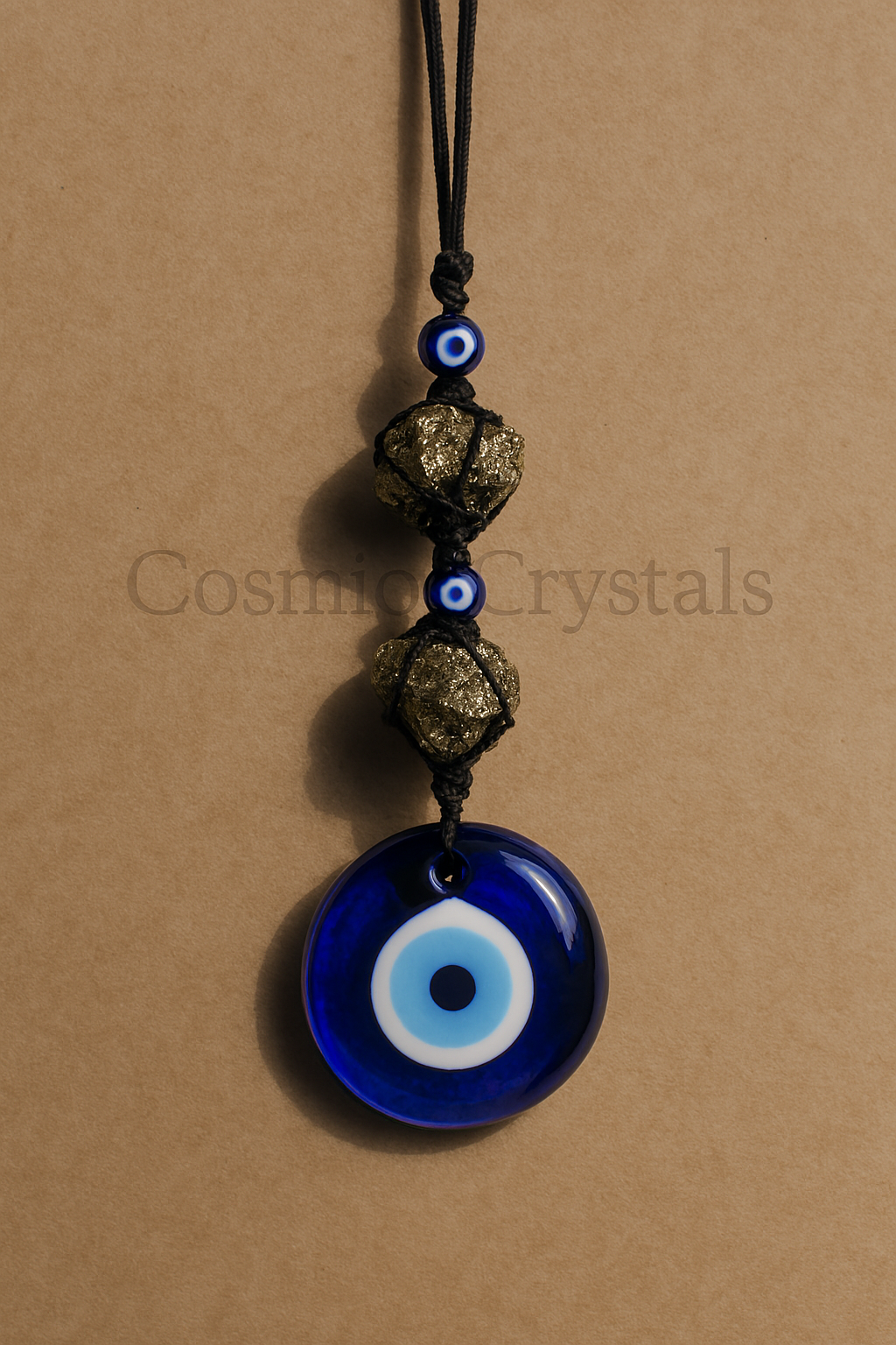 Shield your space with this handcrafted evil eye hanging charm, featuring raw pyrite stones and traditional Nazar amulets for powerful protection from low vibrations . Perfect for your car, home, or meditation space, this artisanal piece blends ancient symbolism with modern design.